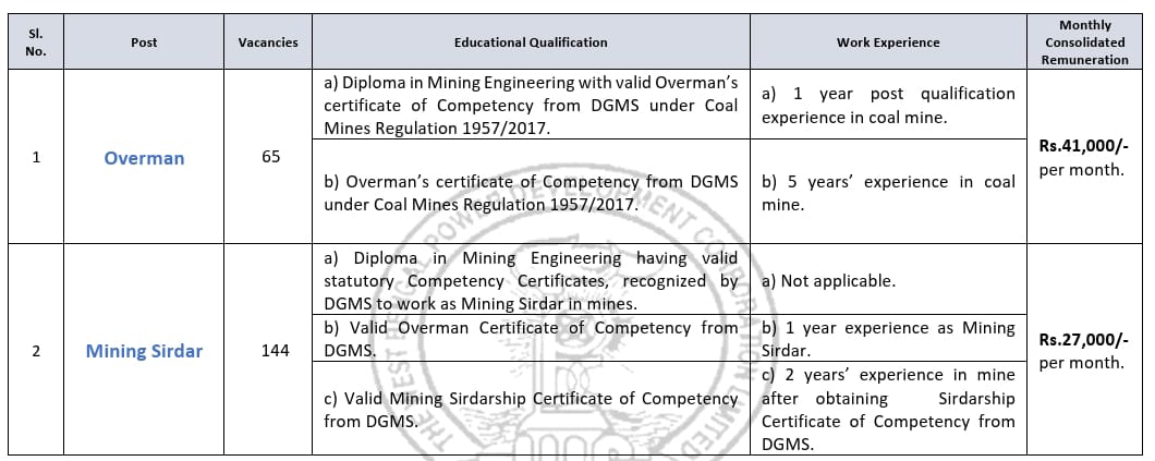 | Mining Engineering | Diploma Trainee | 36 (UR-09, EWS-09, SC-03, ST-10, OBC-NCL-05) | 30 Yrs | Diploma in Mining / Mine Surveying with 60% (55% SC/ST) | ₹29,990/- + DA |